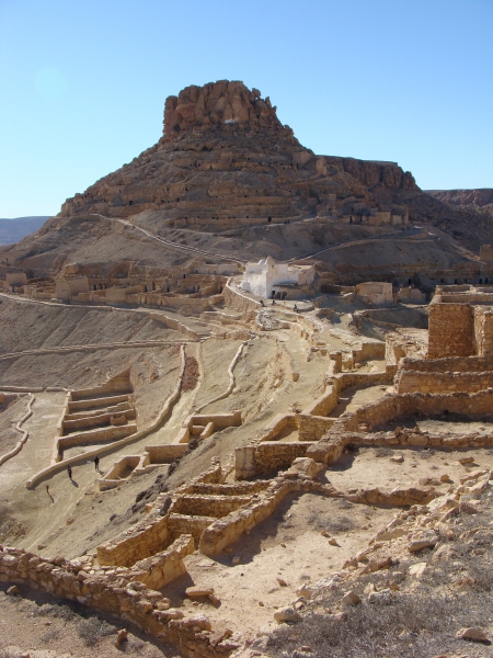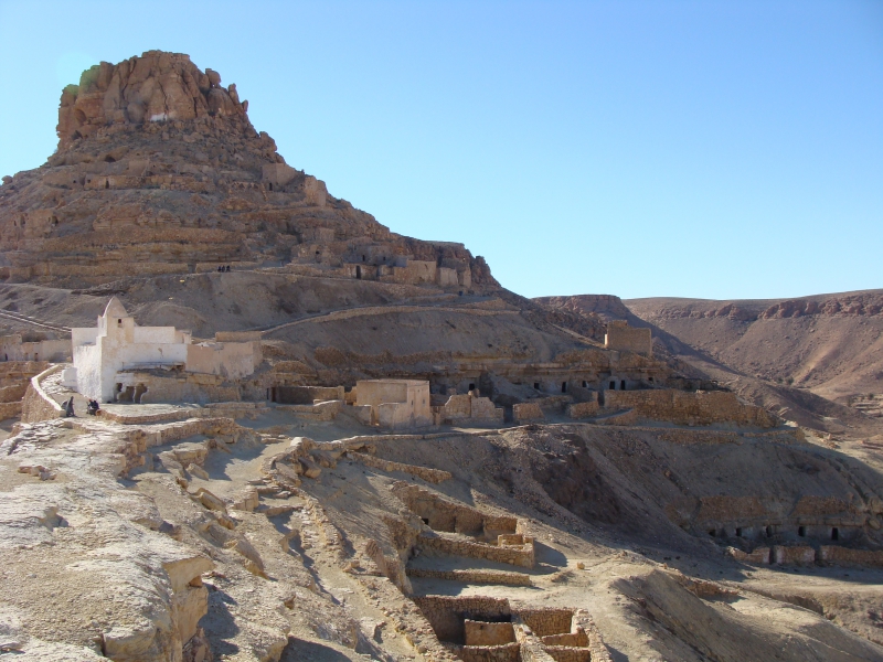 - Douiret est également bâti sur une colline, qui donne une très belle et étonnante vue sur une plaine où dominent quelques pitons rocheux qui ne sont pas sans évoquer (toutes proportions gardées) l’Ouest américain.