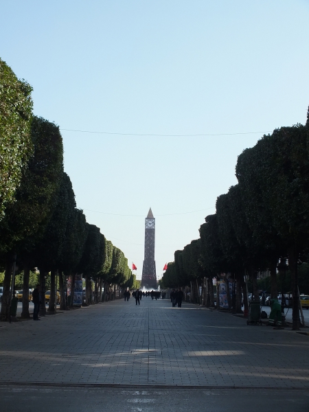 Tunis. Les principaux points d’intérêt sont accessibles à pied où en « métro » (qui est en fait un tramway). Nous avons chaque fois résidé sur l’avenue Habib Bourguiba, l’artère phare de la ville, beaucoup moins chère que les Champs Elysées, rassurez-vous ! En 2013, elle était remplie de militaires et les ambassades étaient largement entourées de barbelés. En 2014, pour l’anniversaire de la révolution et comme la situation était moins tendue, elle était couverte de drapeaux tunisiens, tout comme la tour de l’horloge à son extrémité.