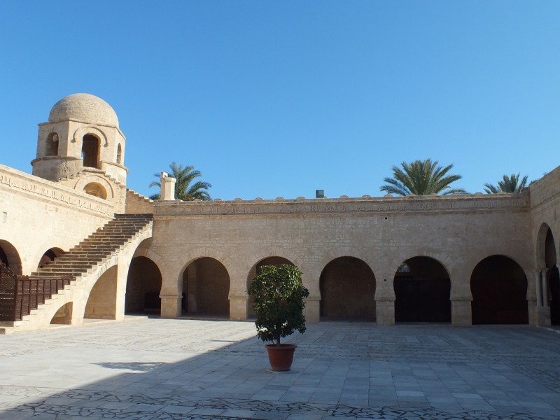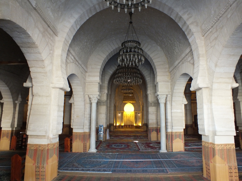 Kairouan. Attention les filles, plus que jamais on évite ici les tenues trop légères ! Kairouan est en effet la première ville sainte du Maghreb. Même si elle est très touristique, il y règne une atmosphère pieuse qu’il faut respecter. La grande mosquée charme par ses proportions, sa cour aérée et son minaret carré. Comme souvent, seuls les musulmans peuvent entrer dans la salle de prière. Une fois encore nous étions tout seuls pour cette visite. De belles zaouïa à voir dans les rues alentour, mais aussi le Dar Hassine Allani : comme dans d’autres villes, une famille a conservé les pièces, meubles et objets qui permettent de s’imaginer la vie dans une demeure bourgeoise de la Tunisie d’il y a plusieurs décennies. A noter que Kairouan est réputée pour ses tapis, auxquels vous ne pourrez pas échapper en vous promenant dans la médina et le souk.