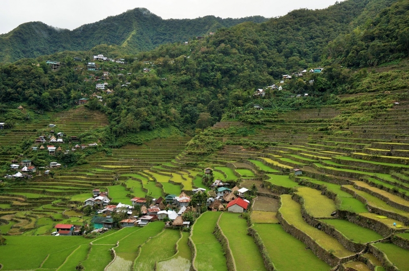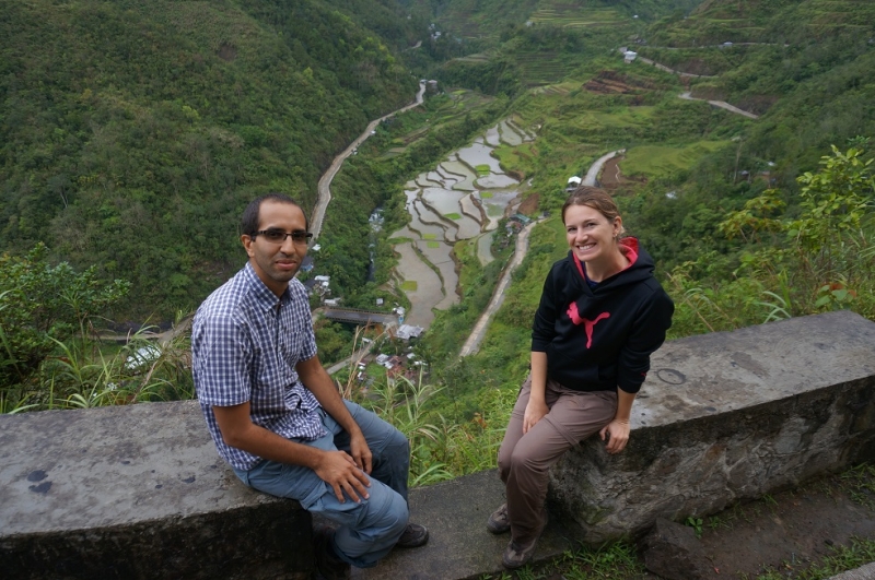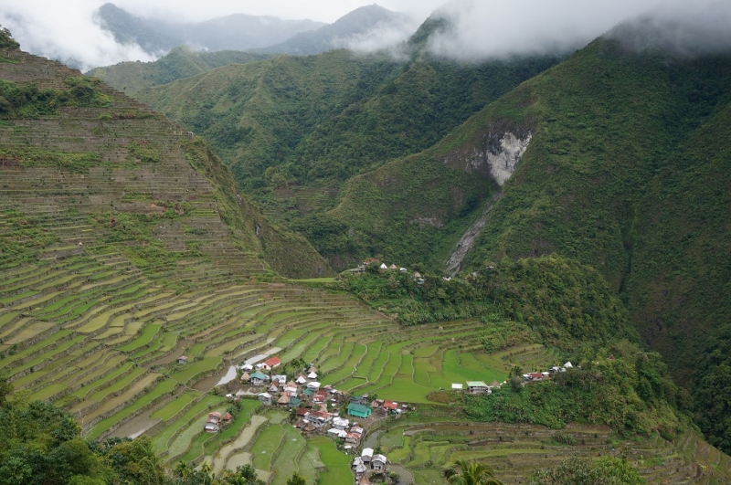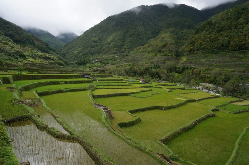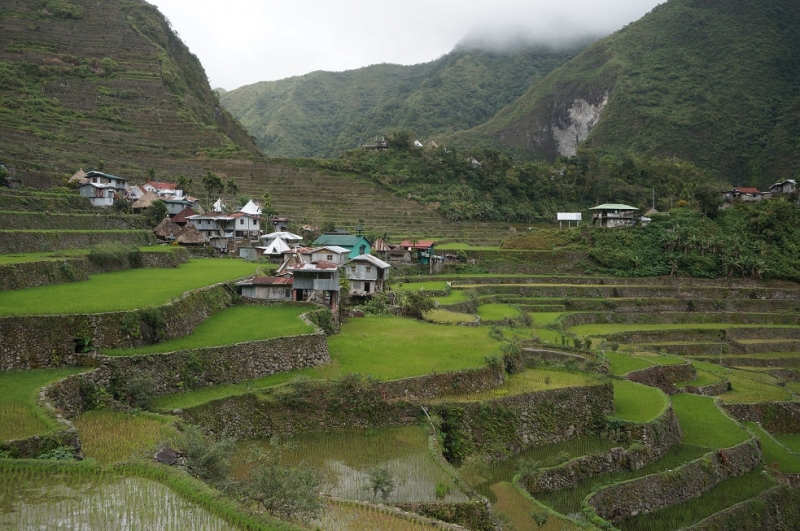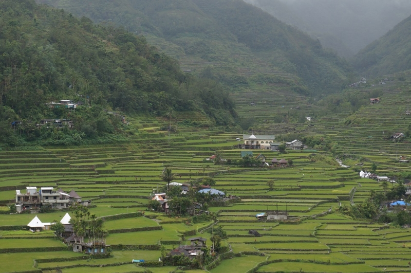 Les rizières du Nord de Luzon. Il faut une longue et éprouvante nuit de bus pour rejoindre cette zone depuis Manille. Mais c’est une étape à notre avis incontournable pour voir une facette des plus intéressante du pays. Le cœur touristique est la petite ville de Banaue, dans la région d’Ifugao. Ses alentours sont célèbres pour leurs rizières en terrasses vieilles de 2000 ans, classées au patrimoine de l’UNESCO. Accompagnés pendant notre séjour par un sympathique chauffeur de tricycle, nous avons d’abord vu Batad, un village au milieu d’une rizière merveilleuse. Pas de route pour y accéder, il faut marcher près d’une heure à partir de « the saddle » point d’arrêt du tricycle. Mais ça en vaut vraiment la peine. Les rizières sont construites sur toute une colline. Il ne s’agit pas de culture intensive mais d’une culture vivrière, chaque famille possédant une parcelle. Un engagement pris avec Greenpeace garantit de plus qu’elles restent sans OGM.