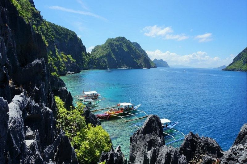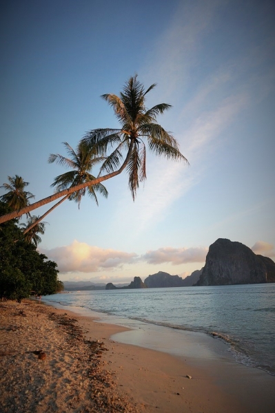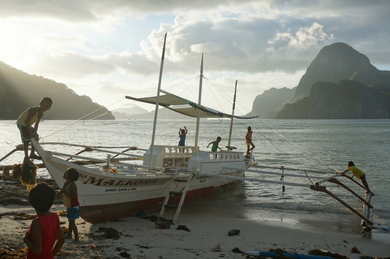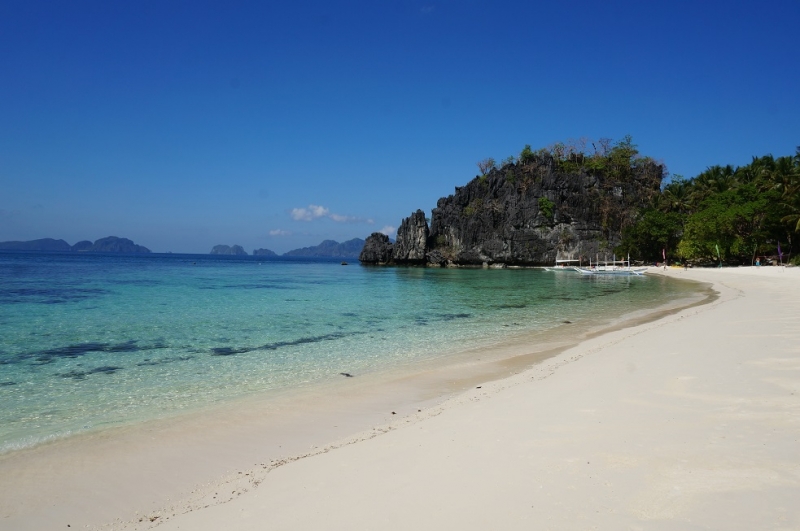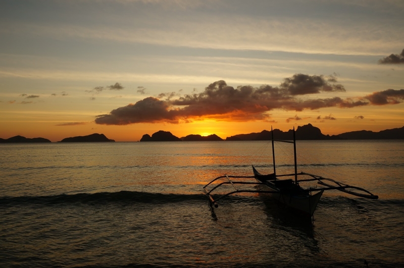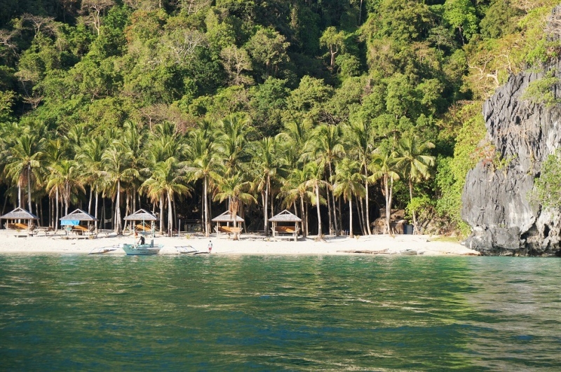 El Nido, toujours plus au Nord est présenté comme le joyau de Palawan. La ville est extrêmement touristique. Les prix y sont donc un peu plus élevés qu’ailleurs, et il faut être malin pour ne pas être noyé dans la masse. Une journée sur la plage de las Cabanas nous a permis de nous habituer à ces paysages bien particuliers de la baie de Bacuit, mix entre la baie d’Halong et Ko Phi Phi en Thaïlande. Les îles karstiques sont des dizaines, et la mer prend des teintes incroyables par endroit. Pour les découvrir, il faut passer par des agences qui organisent des tours (A, B, C ou D). Tout est réglé par le gouvernement local : les heures de départ, le prix, les permis pour circuler etc… D’intenses lectures préparatoires nous avaient mis en en alerte : si nous savions les tours que nous voulions faire, nous ne voulions pas être pris au milieu de la foule sur un bateau surpeuplé parmi 50 autres. Difficile de bien choisir…