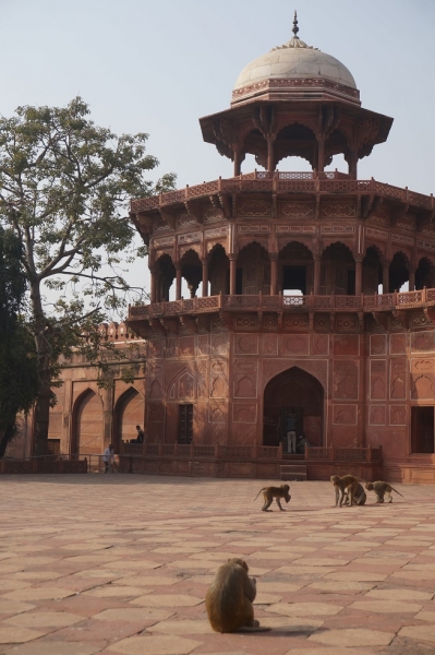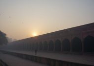 Nous poursuivons la journée avec la visite du Fort d’Agra ou Fort Rouge, pour le coup très fréquenté. Il fut réalisé à la demande du grand Akbar, le premier « Grand Moghol », souverain musulman qui mit fin aux persécutions contre les Hindous. Nous ne pouvons voir que quelques palais (magnifiques) de l’immense ensemble fortifié. Nous poursuivons avec le mausolée d’Itimad-ud-Daulah abusivement appelé Baby Taj. Outre le fait qu’il ne lui ressemble en rien, il faudrait plutôt l’appeler « Papy Taj » puisqu’y repose le grand-père de Mumtaz Mahal (la reine du Taj Mahal) ! Le mausolée est aussi en marbre blanc, avec de très simples décorations intérieures. Nous le parcourons presque seuls et le trouvons bien agréable. Arrive déjà l’heure du coucher du soleil, que nous passons devant le Taj Mahal bien sûr, mais depuis l’autre rive de la rivière Yamuna. L’occasion de le voir en arrière plan de moutons et de bergères, l’envers du décor en somme.